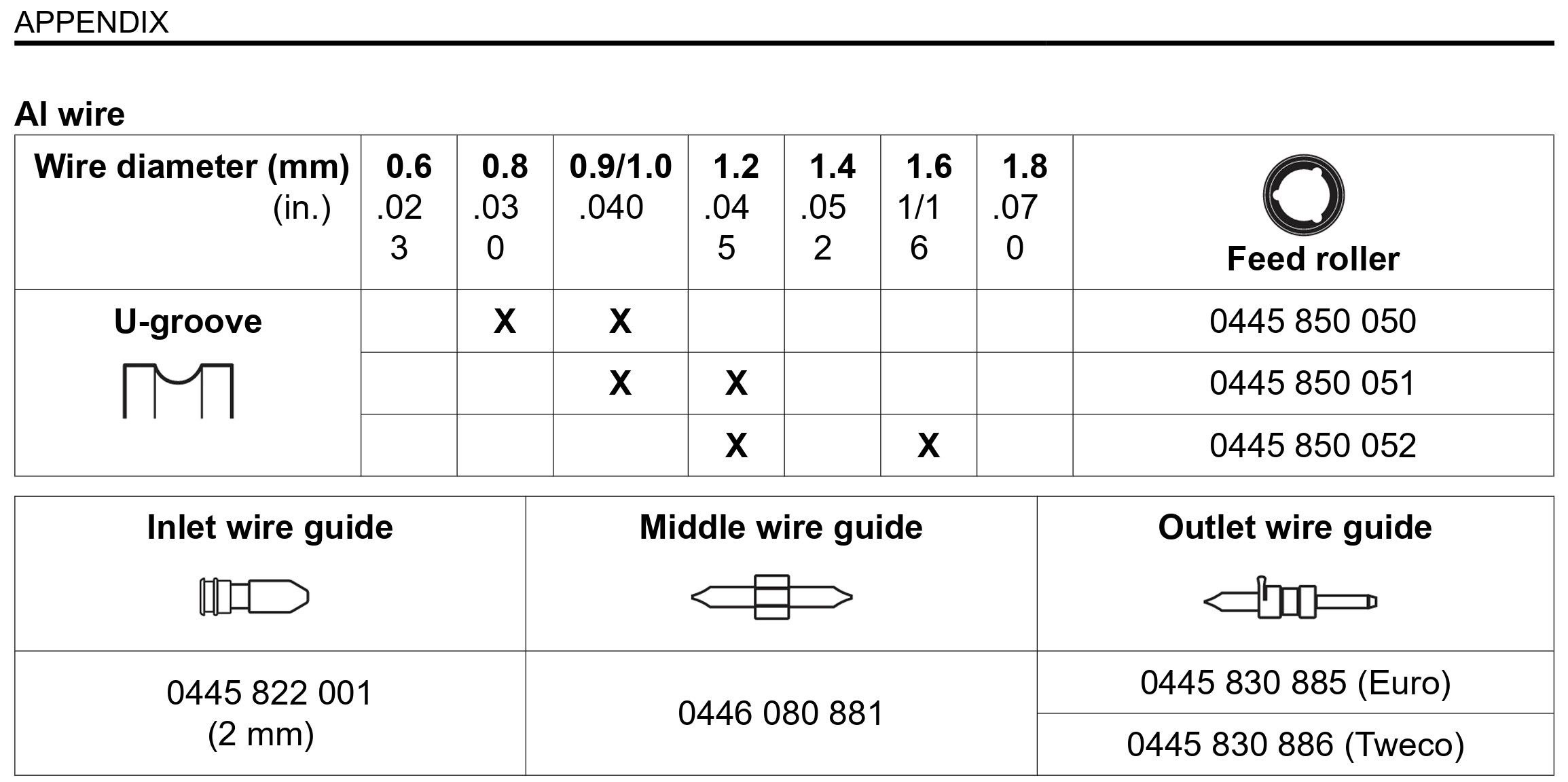 - 4x, 1.0mm – 1.2mm V-Groove solid wire MIG wire drive rollers